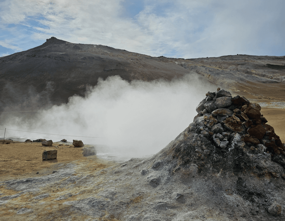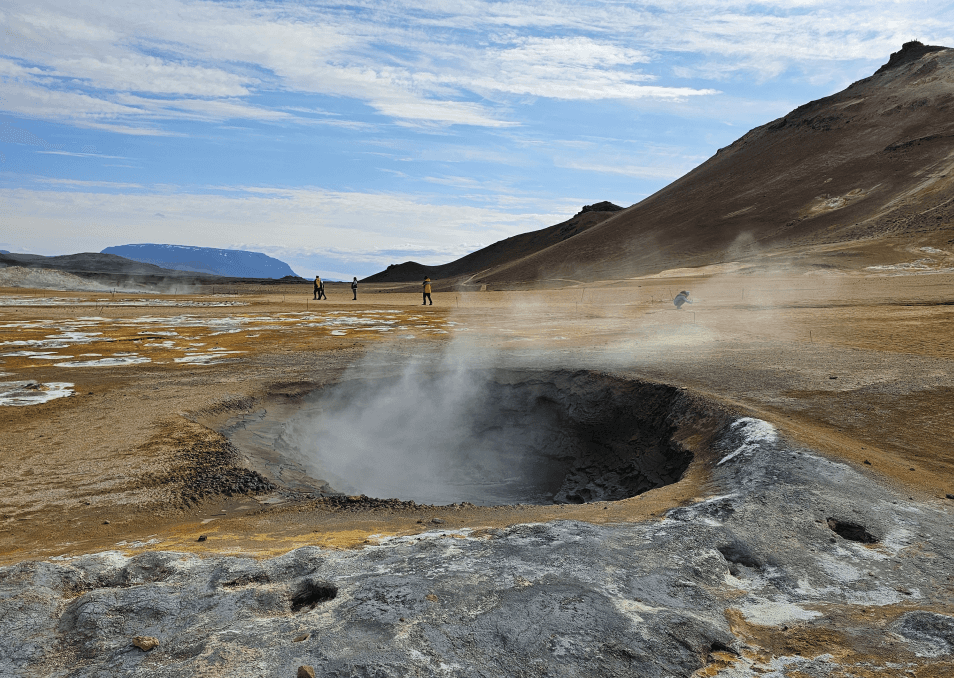 A raw geothermal landscape that feels like another world, often compared to Mars. Steam rises from the ground, mud bubbles, and the earth shifts in shades of yellow, red, and brown. You can also smell sulfur in the air.