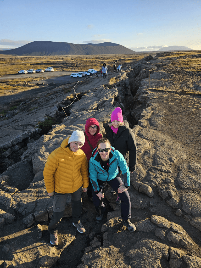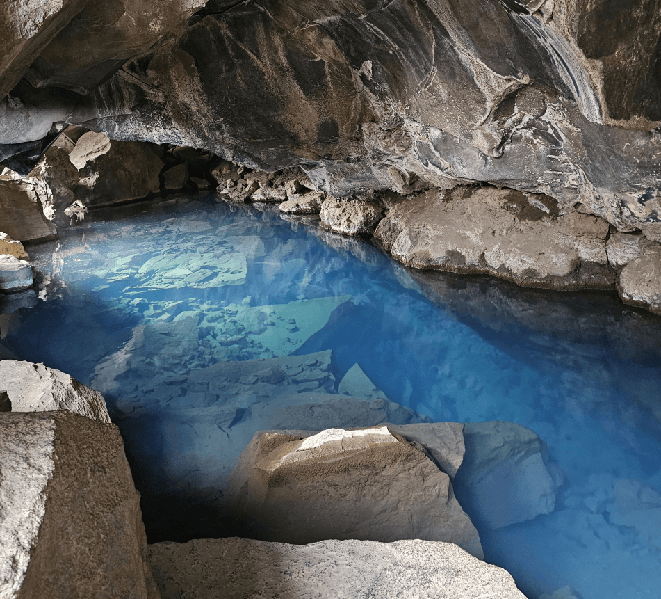 A small lava cave with intensely turquoise geothermal water, creating a vivid contrast with the dark rock. Right beside it, you can see a tectonic crack where you can stand between the North American and Eurasian plates.